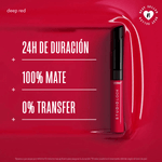 Labial mate líquido de larga duración con nueva fórmula 100% mate, 0% transfer y 24H de duración. Medidas aproximadas: Alto 11.38mm; Ancho: 14.35mm, Fondo: 14.35mm.