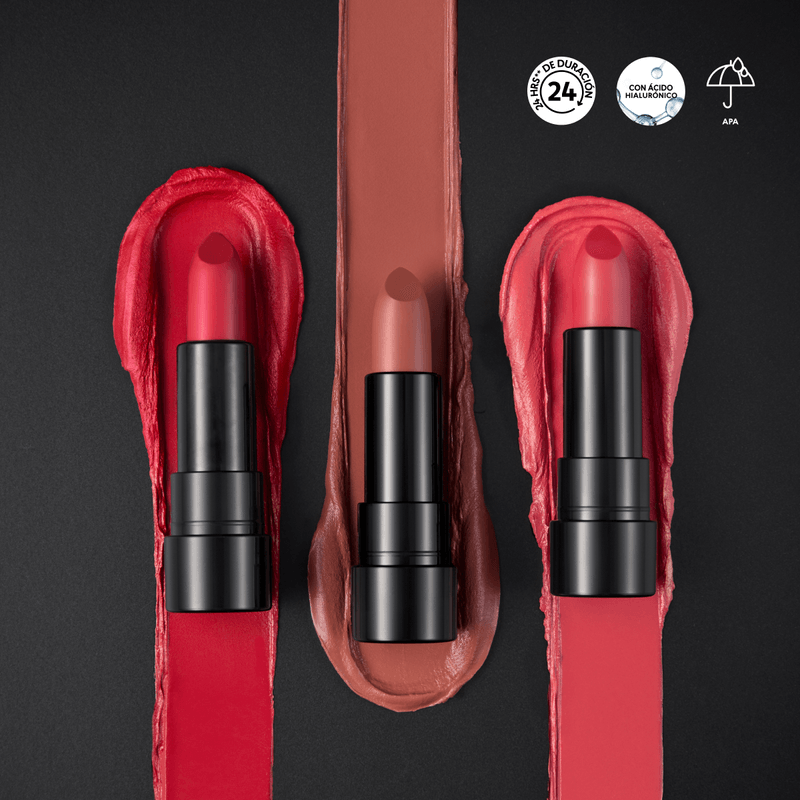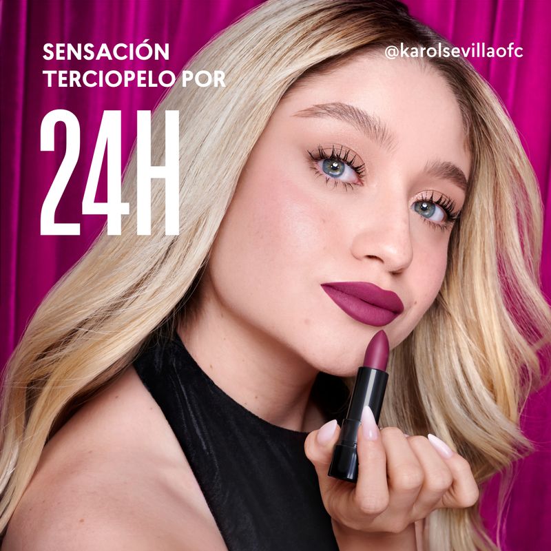 Labial en barra con acabado velvet mate con 24H de duración que no reseca. Medidas aproximadas: Alto 76.6mm; Ancho: 22.8mm, Fondo: 22.8mm.